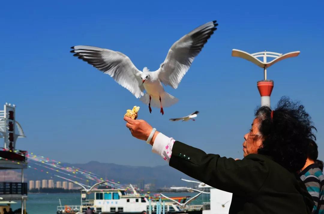 無(wú)論是走進(jìn)翠湖還是海埂大壩,當(dāng)看到無(wú)數(shù)只紅嘴鷗在藍(lán)天里盤(pán)旋、飛翔,你不妨買袋鷗糧喂喂它們,體驗(yàn)一下海鷗從自己高高舉起的手中叼走鷗糧的那份親密感。