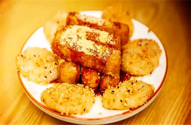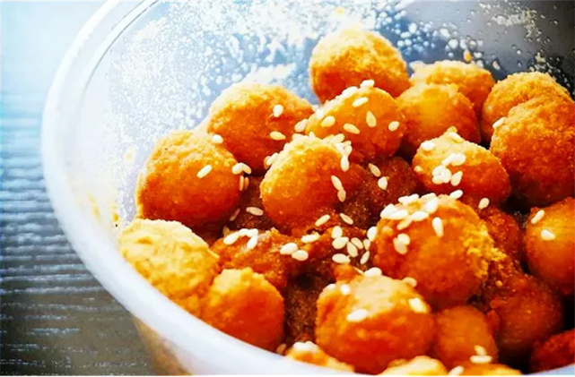 除了鮮花湯圓,豆面湯圓也深受大家喜愛。在湯圓外面滾上一層細(xì)膩橙黃的豆面,糯香酥軟,一下就把人帶回兒時(shí)最常光顧的湯圓小攤:老板的手柄搖啊搖,一個(gè)個(gè)白團(tuán)子懶懶地滾下來,往豆面里一滾,再淋上紅糖和芝麻,那滋味是值得永遠(yuǎn)回味的童年。