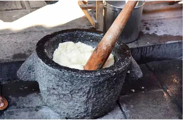 進(jìn)入臘月,云南很多地方都會(huì)有一項(xiàng)重要的年俗活動(dòng),蒸糯米、舂糍粑、打糍粑、晾糍粑,當(dāng)冒著熱氣的糯米飯被放在石碓里,眾人合力用干凈的大木棍把米飯打碎。