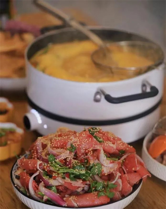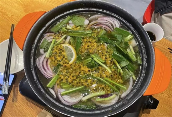 招牌特色「百香果酸湯鍋底」雖然看起來平平無奇,但是沸騰起來的時候酸意撲騰,不是靠寡酸撐起來的“假清爽”,而是濃郁的百香果的酸甜加上小米辣的熱辣的酸湯,只是聞著這味兒就已經胃口大開。