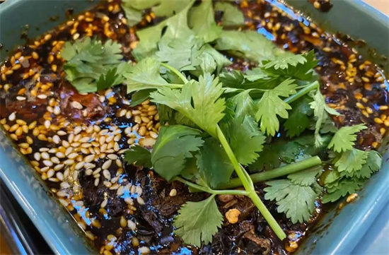 他家的「火燒糊辣子蘸料」早已被吹上了天,糊辣子香而不苦,辣椒里豐富的味道層次全在這一碗了。才從酸湯里撈起的牛肉裹上蘸水,兩種辣味在嘴里交融,讓人忍不住“嘶哈”起來。