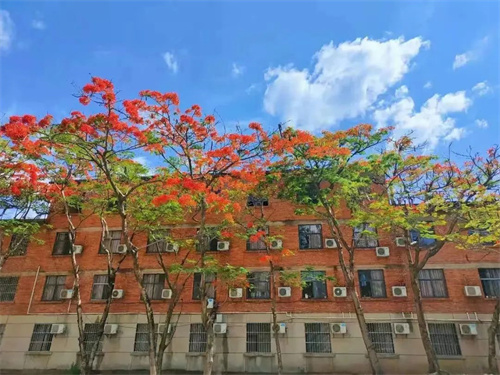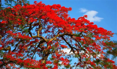 夏風颯颯,鳳凰花亦隨之搖曳,像飽飲了玫瑰酒似的,泛著紅暈,分外妖嬈,一絲絲淡淡的清香縈繞鼻尖。高大的樹干自然舒展,灑脫自如,花朵相互簇擁著,像一團團燃燒的火焰,又像天空中散落的云霞。一朵朵、一團團、一簇簇的鳳凰花便仰臥在樹梢,火紅一片、絢麗奪目,驚艷了夏日的時光。移步樹下抬頭仰望,藍的天、白的云、紅的花、綠的葉,分明是一幅色彩明艷、富麗堂皇的美麗畫卷。比起商業景點的風光,綠汁鎮是那么地低調,默默承載著當地人的依依鄉愁,也深知腳下土地的悠悠過往。