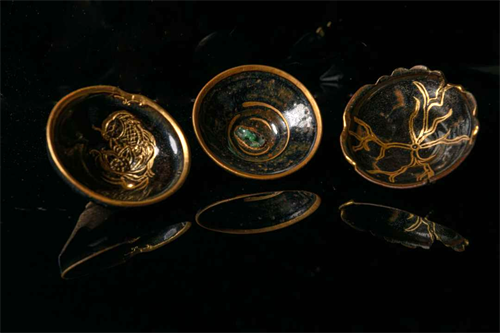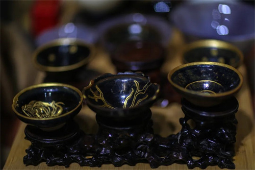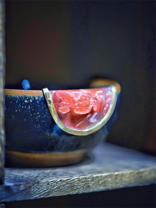《夢魂華夏》:承載著五千年的華夏文明,魂牽故里,夢回前世,流光溢彩中帶著斑駁的歷史印記,只需一眼,便是五千年的風(fēng)雨飄搖......付忠華從河南、河北等多地博物館中汲取靈感,借助石料獨特的色澤和裂紋,雕刻出古代文物的出土場景。一方小小的建盞,有春秋的青銅器、宋代的陶器、遼朝的金器,選用遼寧岫巖縣的河磨老玉料全手工雕刻,24k黃金包邊和24K金幣制造完成,低調(diào)奢華,訴說著歷史演變的歲月沉淀,以及中華文化的博大精深。榮獲云南省工藝美術(shù)第十二屆“工美杯”銀獎等獎項。