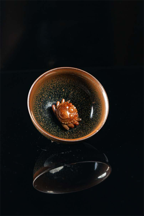 《燒尾》:宋,孔平仲 《孔氏談苑·燒尾宴》:“士人初登第,必展歡宴,謂之燒尾……又說:魚躍龍門,化龍時,必須雷電為燒其尾乃化。”本是宋窯遺址出土的殘次建盞,底部缺失,付忠華用翡翠在碗底處雕刻出一條青龍,將魚躍龍門時電閃雷鳴,天雷擊去魚尾、魚乃化身成龍的場景生動表現(xiàn)出來,透光而看,碗底的青龍澄凈透亮、潤澤又神秘。榮獲中國工藝博覽會“金鳳杯”銀獎等獎項。