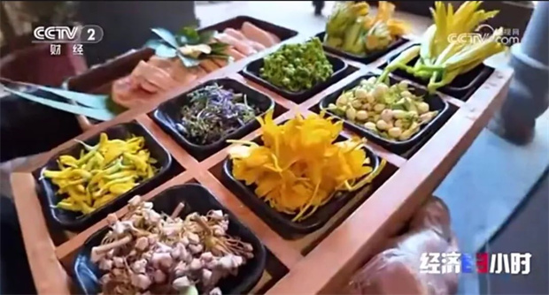 南瓜花,清洗干凈,碼放整齊,色彩搭配也非常講究。八種鮮花加雞湯鍋底,一套鮮花火鍋售價(jià)158元。