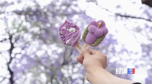 游客來到這里,除了拍照打卡,還被各種各樣的藍(lán)花楹主題文創(chuàng)吸引。從胸針到冰箱貼、從冰激凌到絲巾