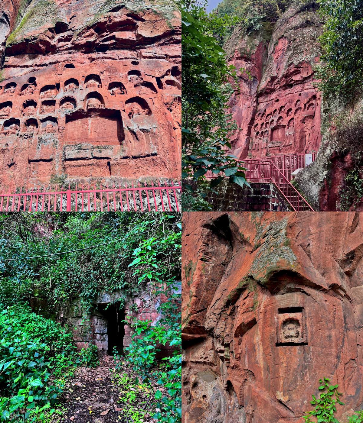 - 石窟依山鑿刻,臥佛、菩薩、羅漢像散落崖壁,風化痕跡更添厚重感。