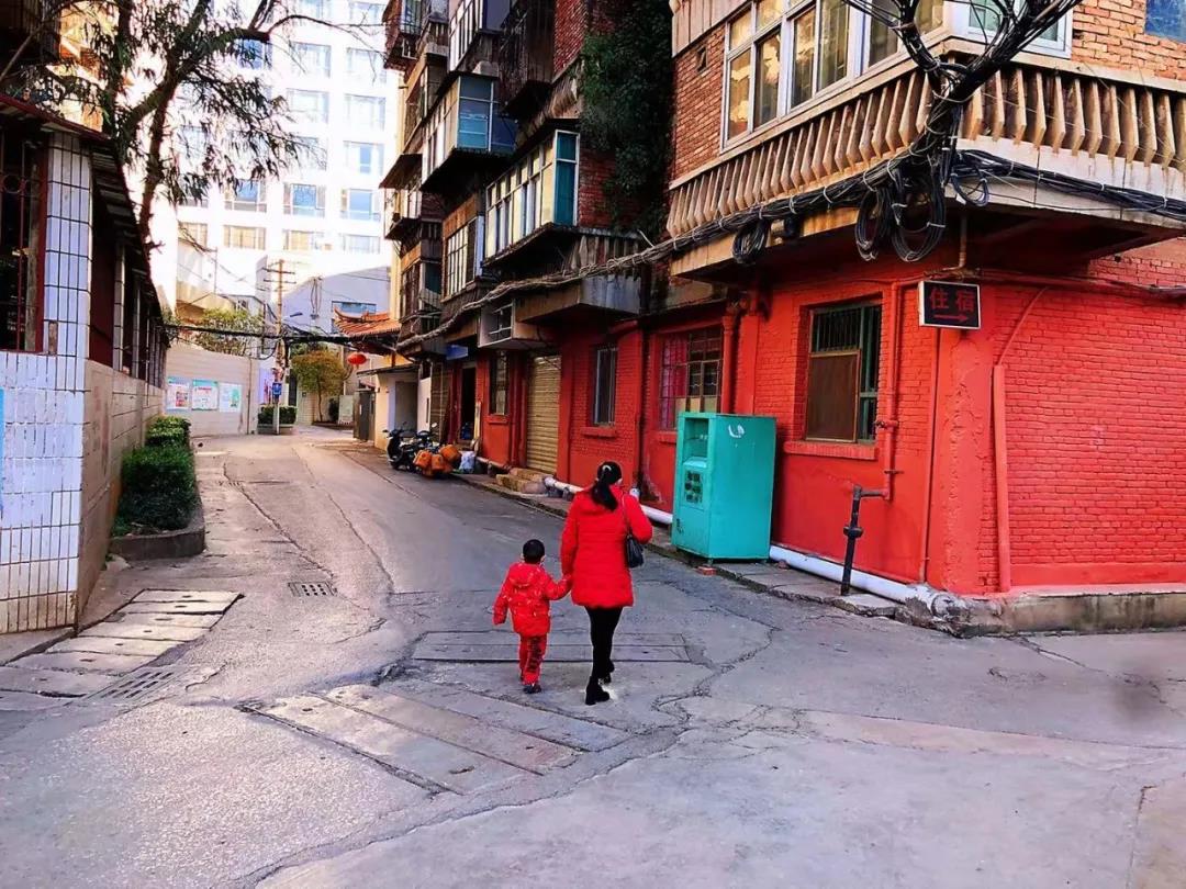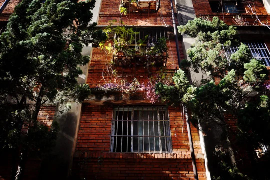 這里老舊的樓層錯落著,磚紅色的墻面有著歲月的斑駁,坑坑洼洼的水泥地上長出了青色的苔蘚,紅與綠的交錯中,復古大片的質感油然而生。