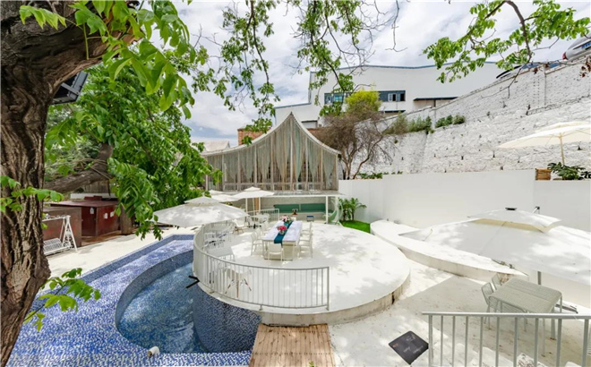 民宿是一棟純白的小樓,遠看上去就像一個純白色的城堡,干凈的白色設計清新夢幻,布置也超級浪漫,搭配月牙形狀的露天泳池非常美麗。