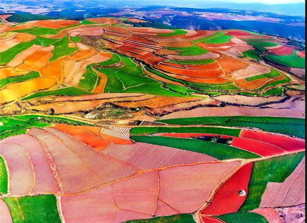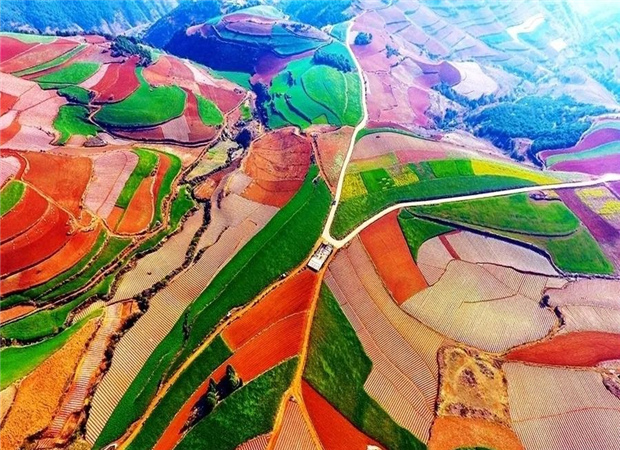 東川紅土地景區,位于云南省昆明市東川區紅土地鎮,獨特的紅色土壤成片地覆蓋在蜿蜒起伏的山地上,與綠色的莊稼、銀灰色的道路、白色的村莊等交相錯雜,形成了一幅幅色彩斑斕、絢麗多姿的巨幅“油畫”。