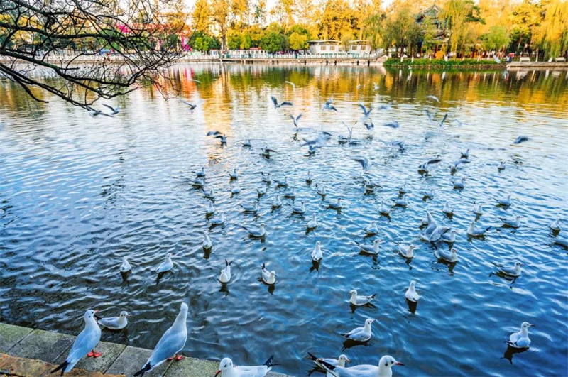 特別值得一提的是,每年冬天有成千上萬只北方飛來的紅嘴鷗在翠湖越冬,嬉鬧戲水,爭搶食餌,給翠湖增添了無限的情趣。