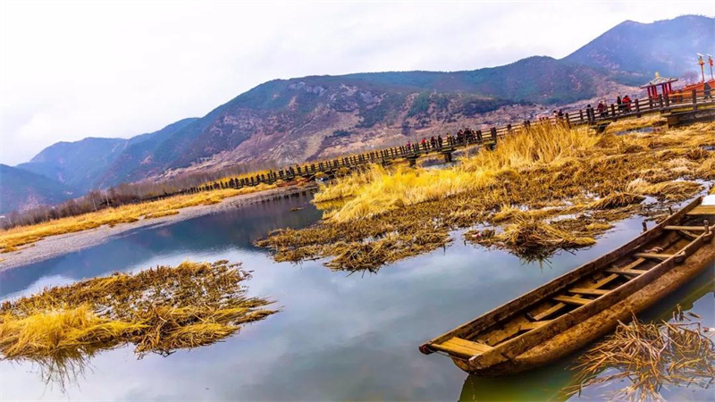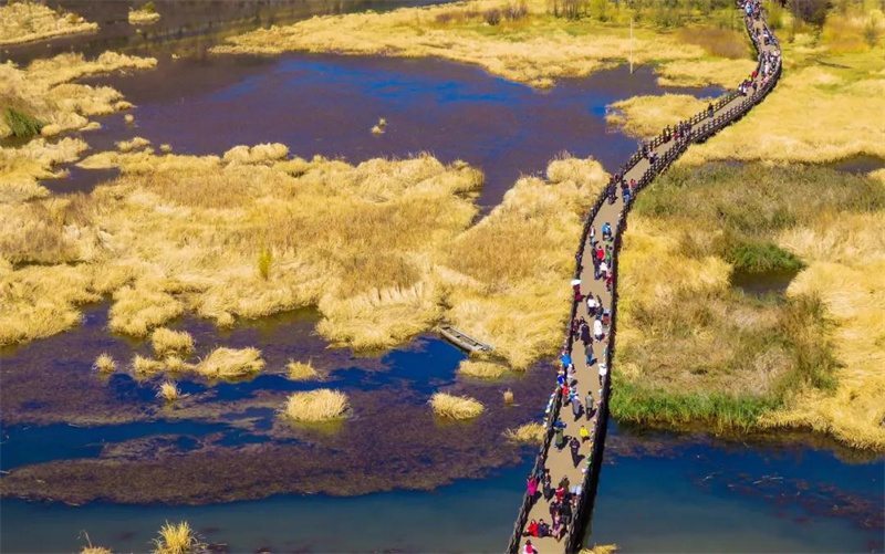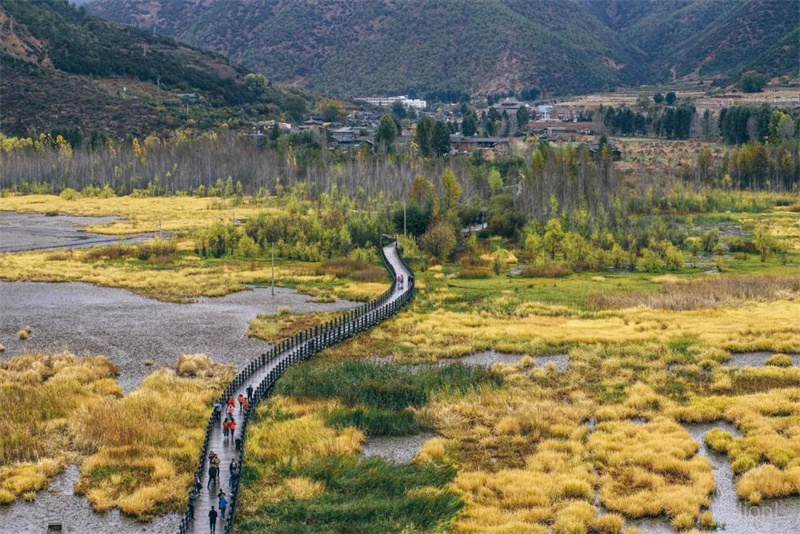 秋天,或許是這里美的季節(jié),枯黃的草海,蕩漾著金色的波濤,從走婚橋上穿過,仿佛穿梭在一個金色的童話。