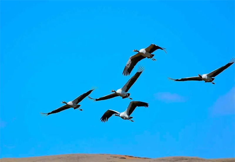 每逢冬季,大批黑頸鶴來此越冬,原本寂靜的草原、無聲的湖泊頓時活躍起來,給枯燥的寒冬帶來一股生機。