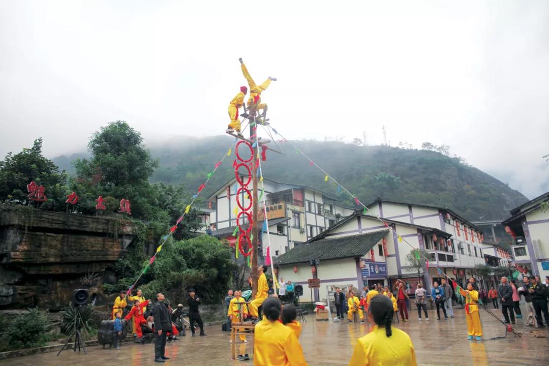 從昭通水富南下,山谷里綠意盎然,云霧繚繞中,隱約能看到數(shù)枝茶花盛開(kāi),驅(qū)逐了清晨的一絲寒意。往宜賓方向走,萬(wàn)畝茶花林深處,是興隆高竿獅子舞的故鄉(xiāng)。