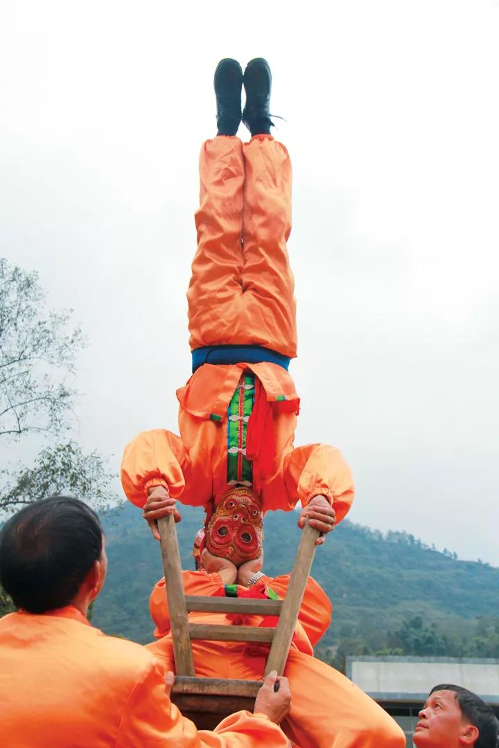 高竿舞獅是所有舞獅動(dòng)作中最精彩的表演形式,主要在一根長(zhǎng)約6米的竹竿上進(jìn)行。竹竿直立在一張?zhí)刂频淖雷由希窀偷纳厦娼壣弦桓沽⒌陌宓剩Q(chēng)為“翻天云”。兩人組成的“獅子”沿著竹竿,徒手攀上高空,在高空四方朝拜,表演內(nèi)容包括高空倒立、匍、跌、翻、滾、栽倒樁、懸空倒吊等。在高空中,表演者需要完成“一柱擎天” “龍頭鳳裝” “倒掛金鐘” “空中懸獅” “白馬獻(xiàn)蹄” “鷂鷹展翅”等高難度項(xiàng)目,需要非凡的平衡能力。