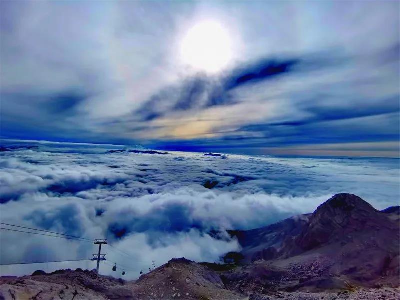 當浩瀚的云海在玉龍雪山奔涌之時,整個山區(qū)形成茫茫海面,只留巍峨的山峰,像點點島嶼漂浮不定。柔柔的云海,時而滾作一團團棉絮,時而化作長長的綾羅,繞著這個山峰飄忽而來,又悠然地從另一處山峰飄忽而去。云海搭配藍天、微風,瞬間便讓煩惱一掃而空,留下的只有快意舒適。