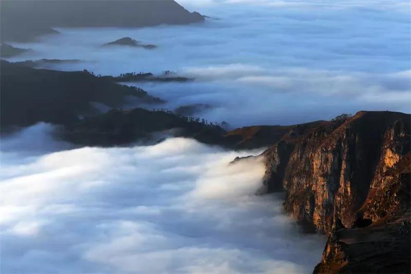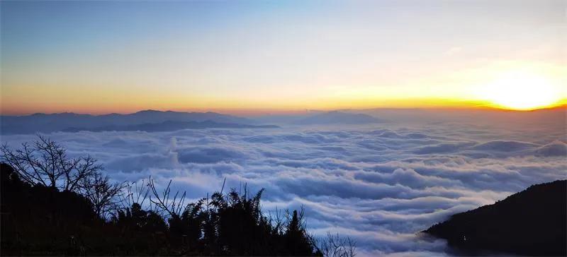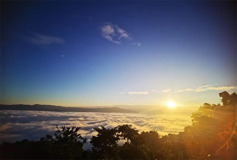 哀牢山“云海日出”景觀,堪稱“滇中云海一絕”。晨光熹微,云海翻騰,潔白的流云把一座座山巒遮掩得若隱若現(xiàn),云霧輕輕地碰撞、交融、推搡,緩慢翻騰、起伏,悄無聲息向腳下翻滾而來,似有騰云駕霧的暢快之感。