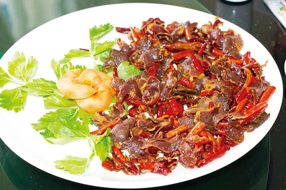 羊干巴的腌制非常講究時令,非得到冬至才能開始制作,最好的制作時節便是冬至后的一個月內。用精鹽腌制六、七天,拿出來自然風干。“我嘗試過在各個時間腌制羊干巴,但就這個時節的干巴會產生一股老干巴特有的清香。其實這是傳統的老方法, 腌干巴溫度一高就不行?!毖蚝笸冗m合制作干巴,“每只羊就那么點腿肉,有時候腌的量根本供不上賣,還會斷貨?!彪缰坪蟮难蚋砂颓斜∑?,和干辣椒溫火慢炒,色澤紅亮,肥瘦相間,膻味不重,口感酥脆,帶著不同于其它干巴的特有香味。
