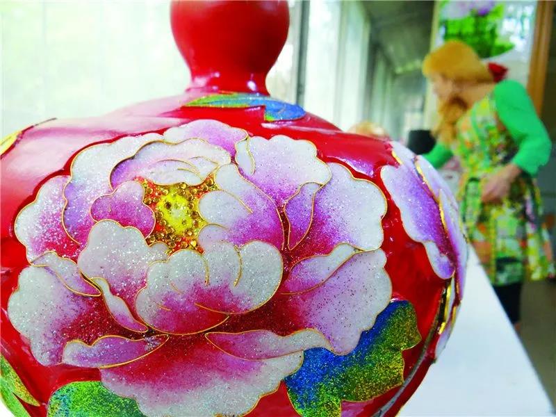 大紅的底色上,金絲勾勒出的數朵牡丹花嬌艷綻放,幾只蝴蝶在上面翩翩飛舞,點綴其間的金粉若隱若現。這是掐絲彩嵌黑陶工藝品“寶葫蘆”,由三個部分組合而成,聚寶盆寓意聚福聚財,中部和瓶頸組成的花瓶寓意平安。