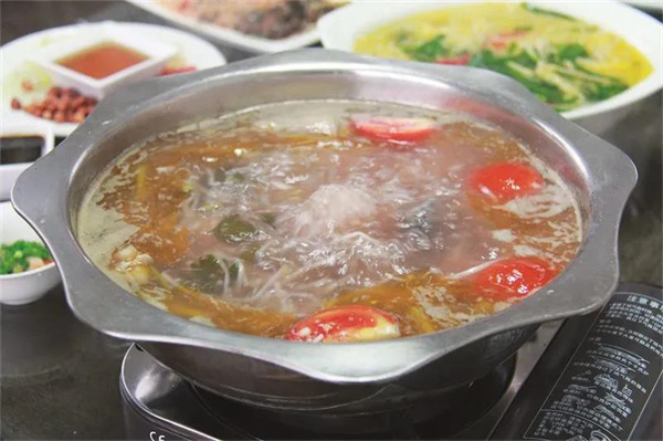 用雞腳和骨頭來打湯,等湯味基本鮮甜了,再兌入發(fā)酵好的酸湯,在過程中,二者的比例很重要,比例正好的岜夯雞,酸中帶有鮮甜味,油而不膩。在當?shù)兀埠秘S富口味的人,會在岜夯雞中放入包括蒜汁、姜絲、胡椒、辣子、酸筍、醬油等佐料,多達18種,加入佐料后的岜夯雞,風味更足,吃起來口感層次則更加豐富。也有喜好岜夯雞本味的食客,會打一碟蘸水,一鍋一碗,得食兩味。