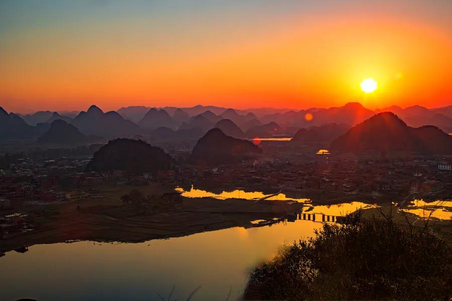 主峰海拔1555米,高出湖面108米,沿著石徑登上觀景臺(tái),可將普者黑美景盡收眼底。此外,這里還是觀賞日出日落最美的地方。