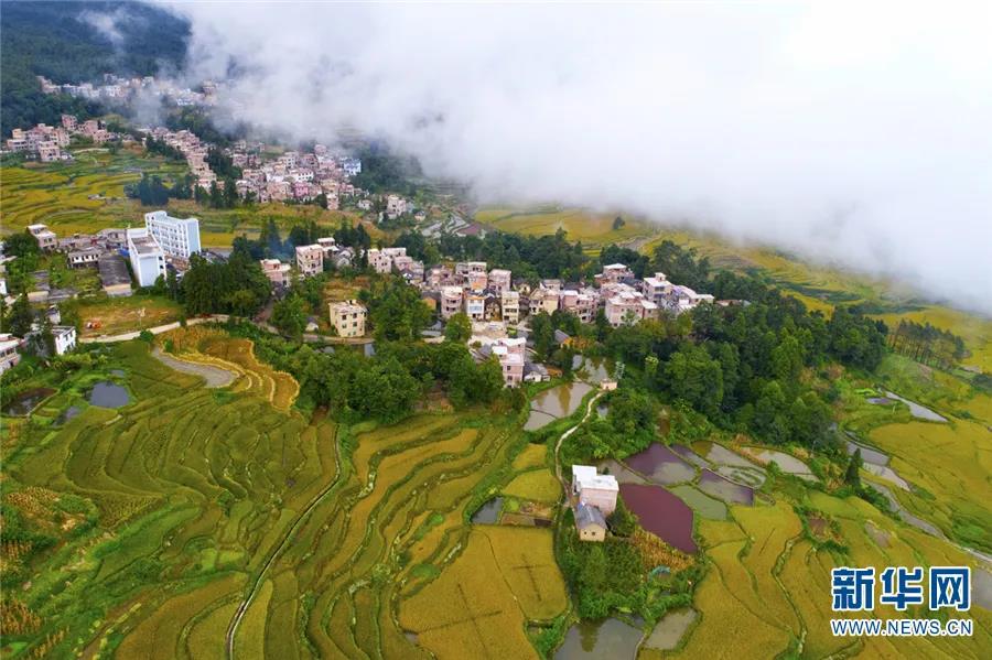 太陽光線透過云層分片照射在金黃的稻田里,絕美的光影使人震撼,大地的調(diào)色板,給秋野披上了靚麗的迷彩。村寨與稻田相互交織,一間間獨(dú)具特色的民屋守望著這片成熟的秋實(shí)。